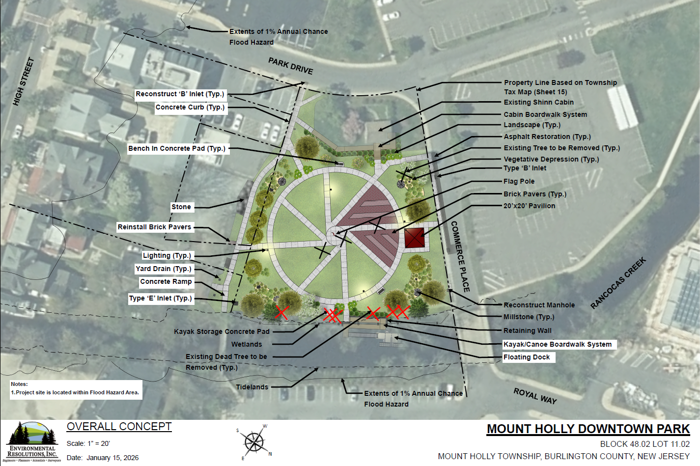 PROJECT SCOPE: The Township of Mount Holly proposes to create the following new facilities at West Side Park: Constructions of new sidewalks, a pavilion with a gathering area, provision of an accessible route to the cabin, and a kayak launch with new site lighting. A concept plan showing the proposed changes, a preliminary cost estimate, and an environmental impact assessment for the project can be found at: https://twp.mountholly.nj.us/ (scroll to links and rendering included below).