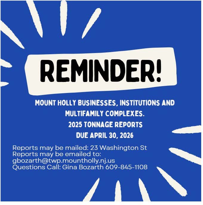 Mount Holly Businesses, Institutions and Multi-Family Complexes – Your 2025 Tonnage Reports are Due April 30, 2026.