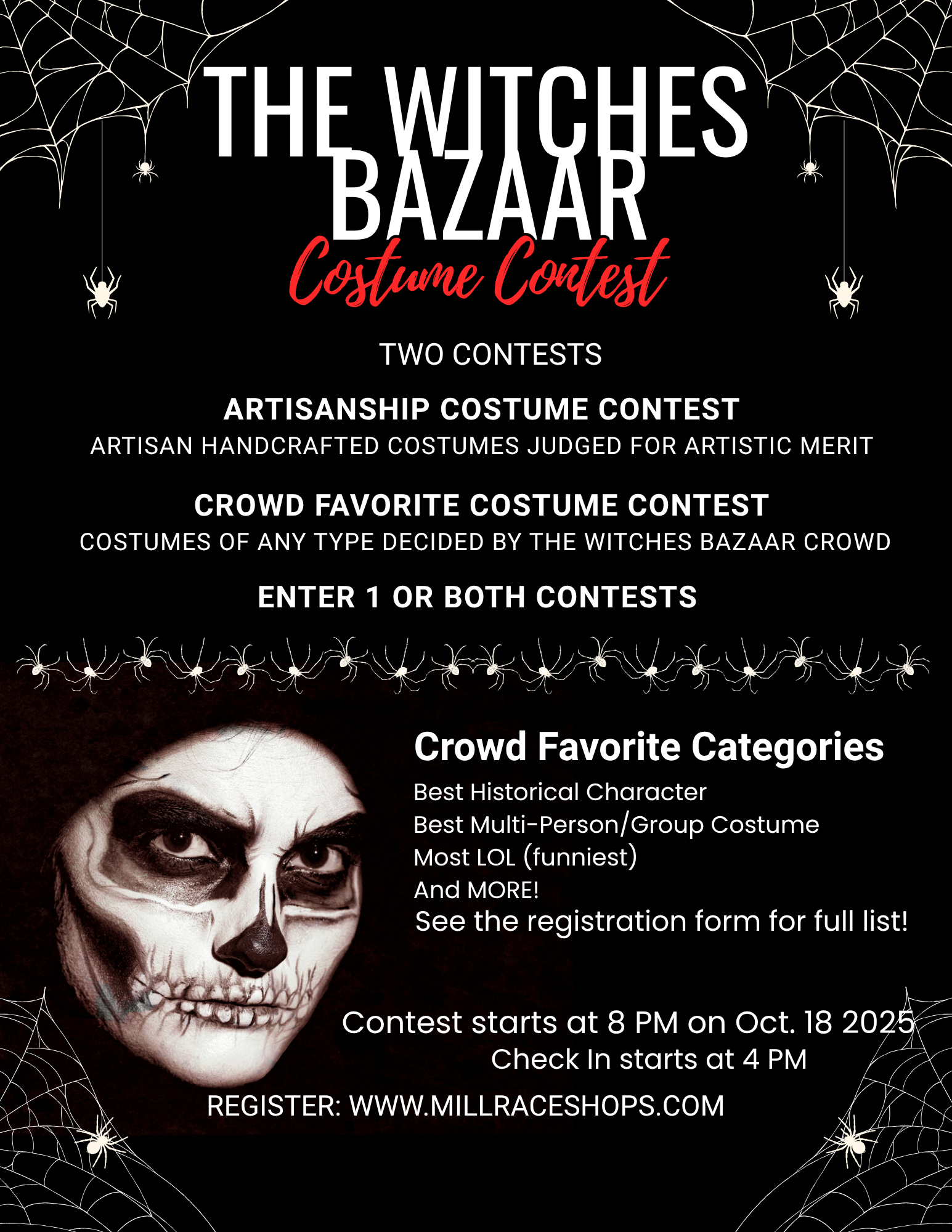 For those individuals ages 16 and older – Dress up in your best costume and enter the “Artisanship” and “Crowd Favorite” costume contests! Contest entry is $15 dollars – registration is required, sign-up online here: https://www.millraceshops.com/costume-contest-registration